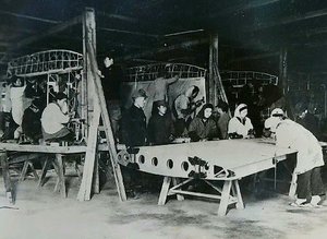 工場は主翼班、尾翼班等、10班に分かれて作業をする班制度を取っていました。大川の木工技術者や大川工業学校(後に筑西工業学校とも呼ばれていた)の学生などや女性も加わり常時700人がいて、この中に桐里工房の従業員であった、故黒田氏がこの事業に大川工業学校の生徒として動員されていたと本人から聞いていました。