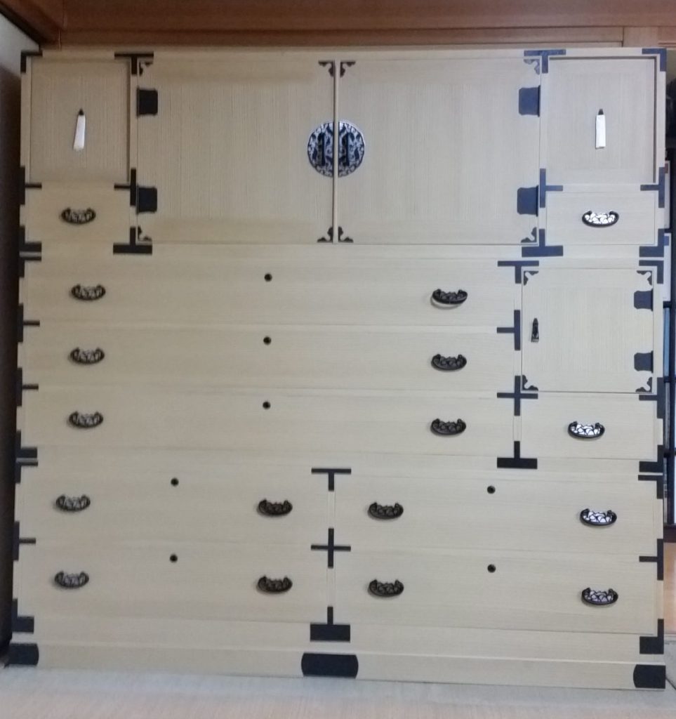杉と貴重な桐を主材料に使用して、手作りされた榎津箪笥は、間口巾が一間程ある大型の収納箪笥が主で、堂々とした外観に、板の厚みを出来るだけ厚く仕上げる事で堅牢な造りになっていました。